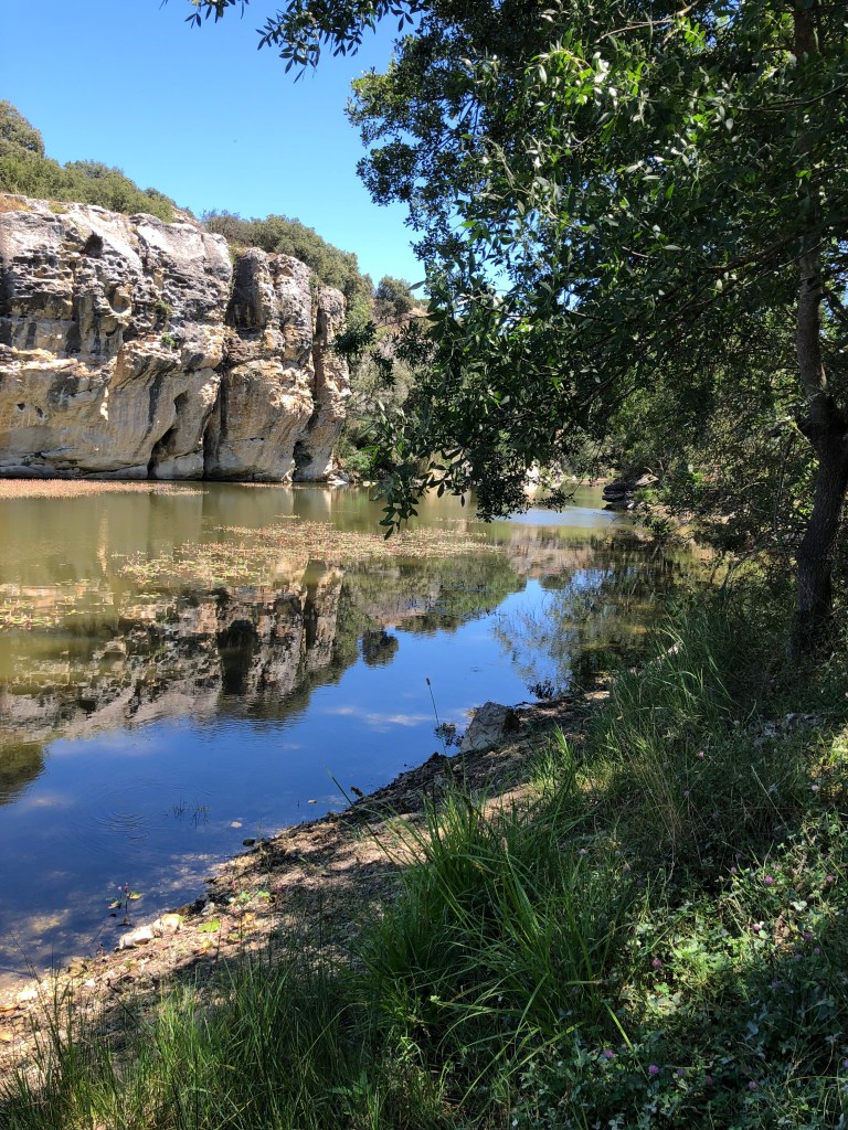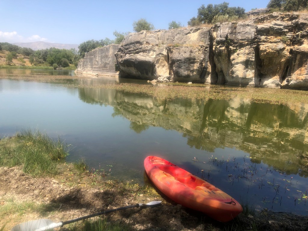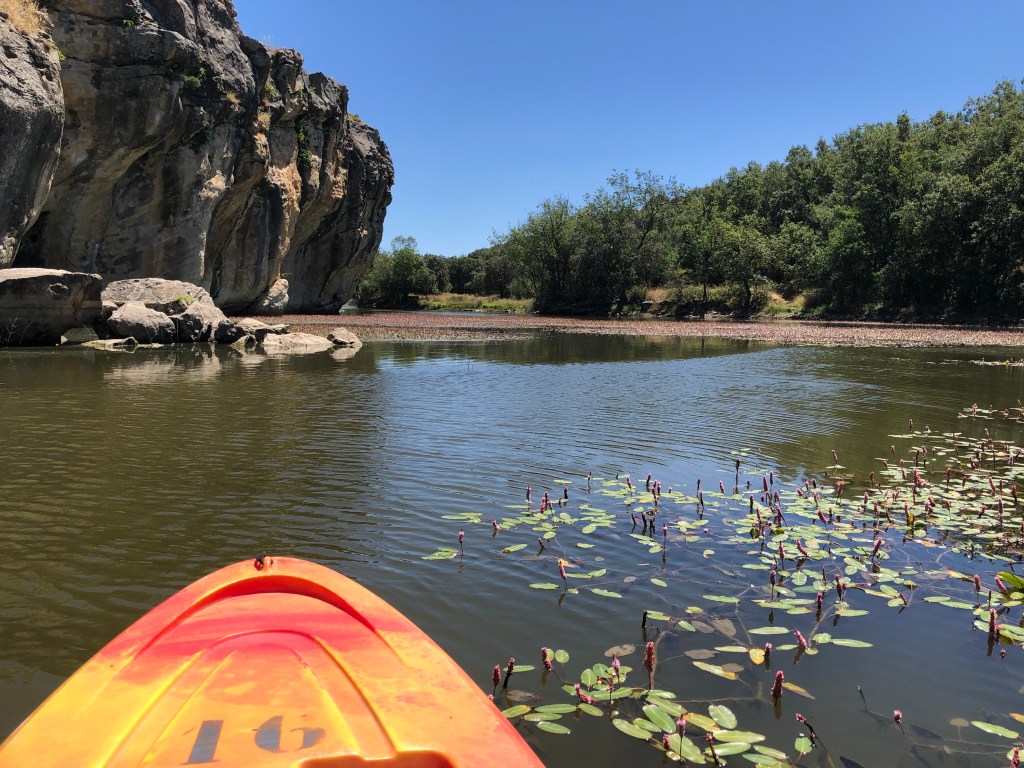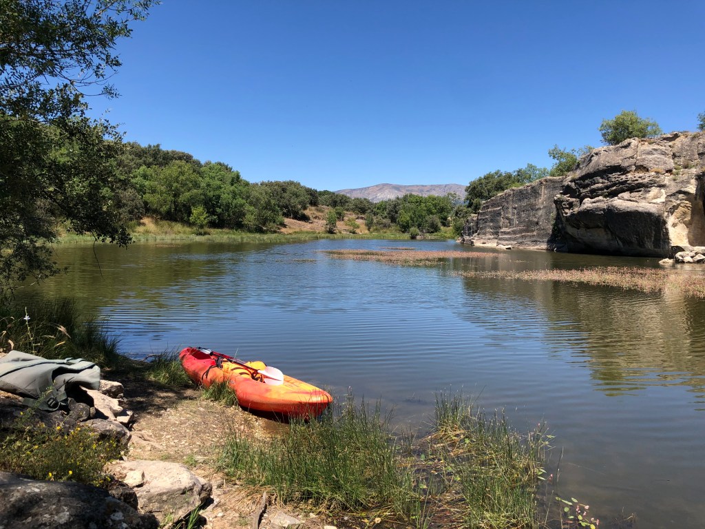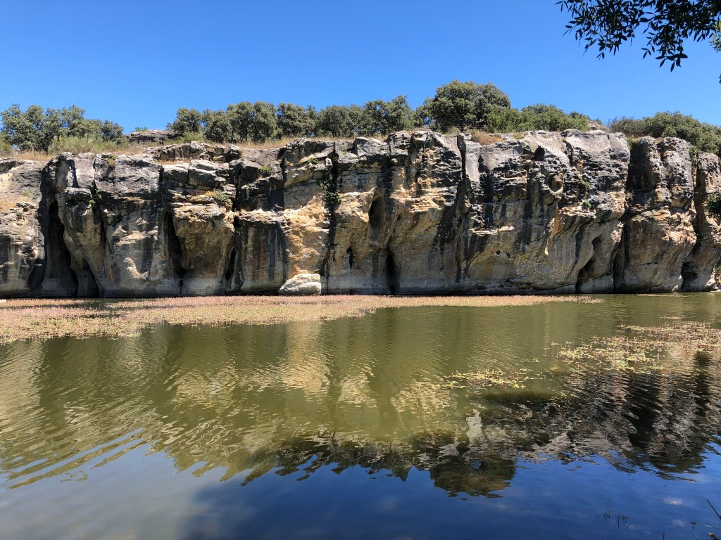 I paddle on, blissfully happy in this peaceful little section, the high rock walls of Los Alcores on one side, shady forested hills on the other. I paddle through the shade, enjoying the plunge in temperature, then back into the sun and across to the towering rocks on the other side … this is only about 8 kilometres paddle from where I started at the Club, and much nearer over the hill on foot, but it feels like another world.