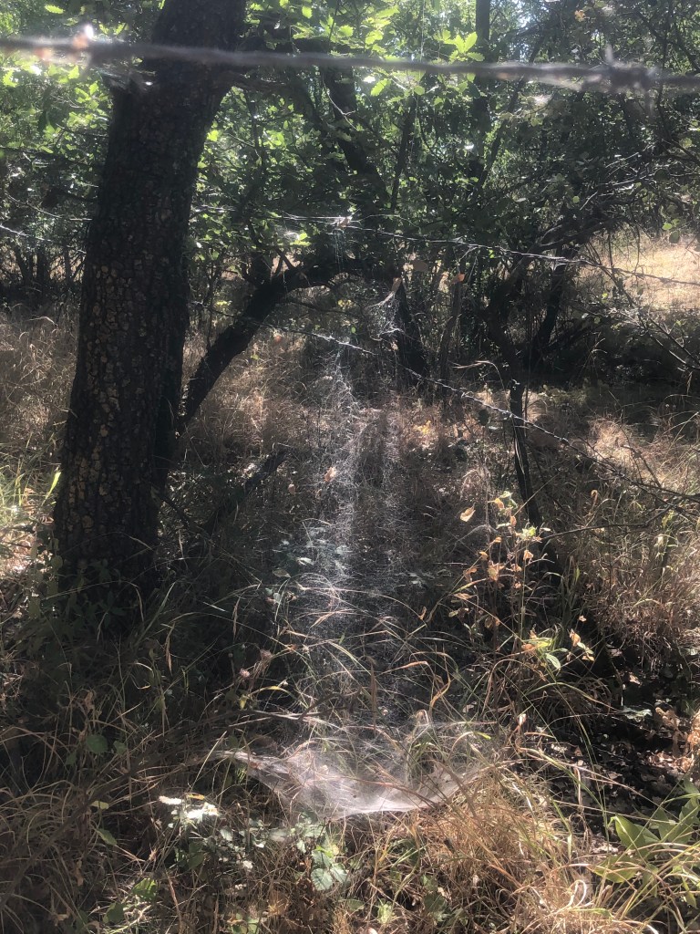 There isn’t much else to do, the lakeside path I am perched on is closed off with barbed wire one way, and disappears into the woods the other. I walk it a little way, and spot this enormous spiderweb glinting in the sun, but don’t go far.