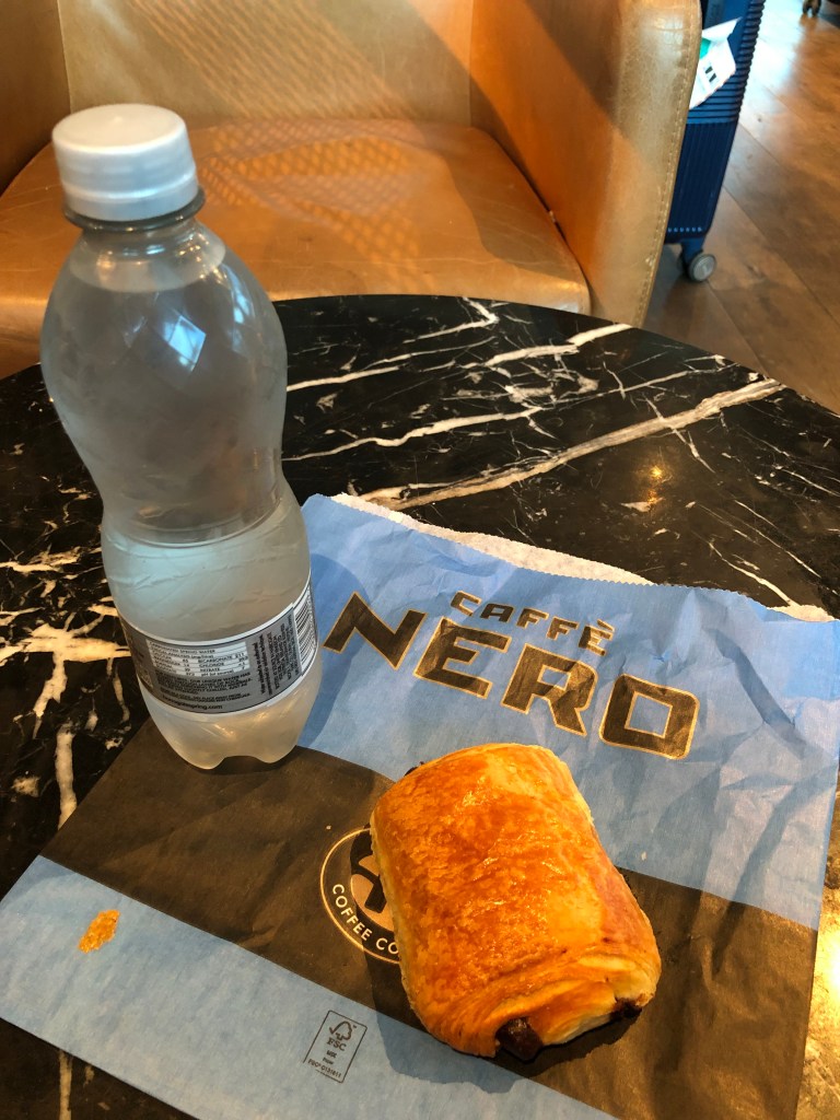 I want something small, and don’t want another coffee, so think I’ll get something like a pasty and a bottle of water. They only have sausage rolls of a small-enough size but I dither, I’m not a big fan of the sausage roll, so I grab a water, and check to see what they have on the counter, then under pressure to decide everything immediately by the queue forming behind me, I order a pain au chocolate that, defying the laws of perception, seems to smaller as it gets closer to me. Oh well, a tiny pastry and a bottle of water … but oh, what the fuck have I done, I’ve only been and gone and bought fucking sparkling again … why do I do this?