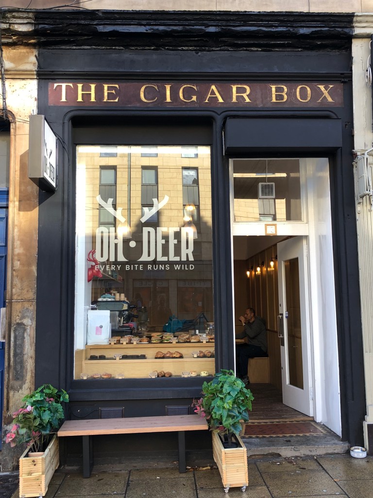I get up earlier than I intend and am ready too soon for my 10am checkout, so, having slagged off Greggs earlier, and despite the pull of predictable chains with their known offerings like Caffè Nero and Starbucks just yards further up the road, I decide to go to an independent coffee house for breakfast: Oh Deer.