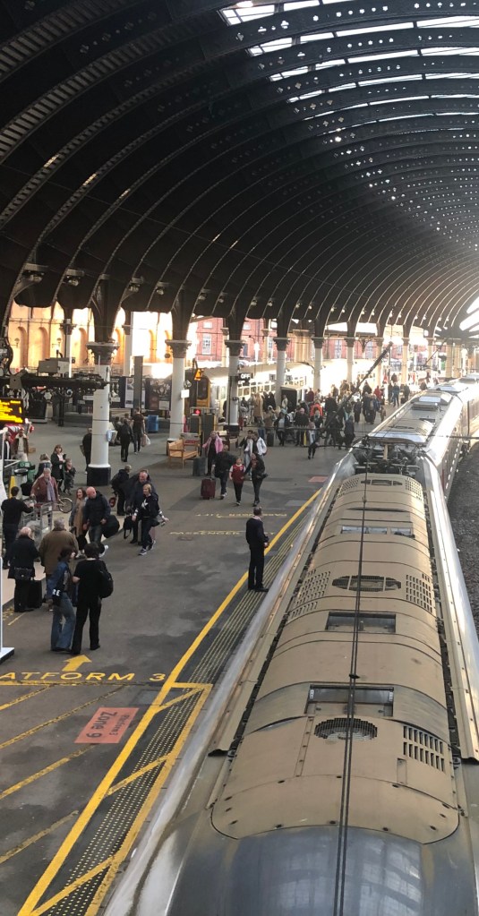 The scenery flattens out as we head south, to Darlington, and across the border into Yorkshire. Here the Vale of York takes over, shoving aside the hills and forests of lands further north, replacing them with the iron-flat fertile country of the Vale. Northallerton is next, and then finally – for me, anyway, the train continues south to London – it’s York where I get off, and dozens more people pile on, some of them as I’m trying to get off.