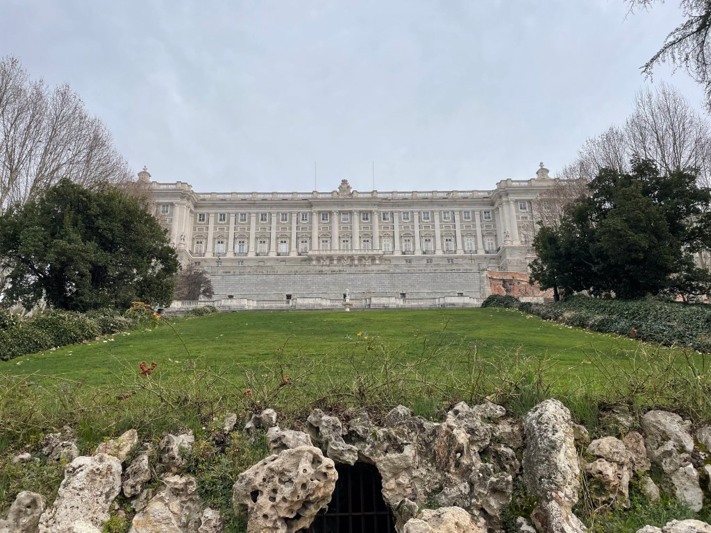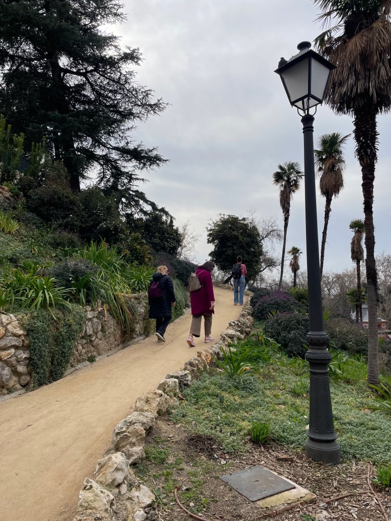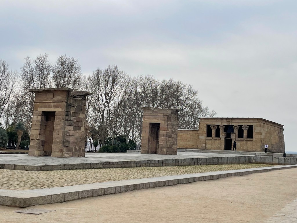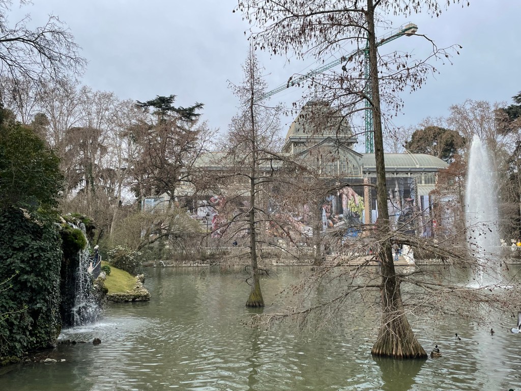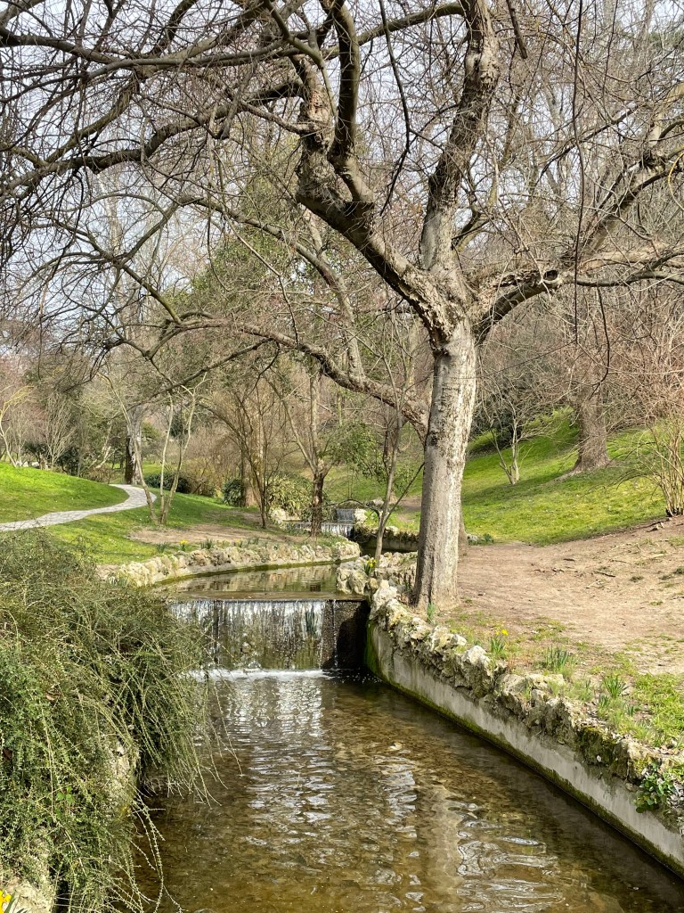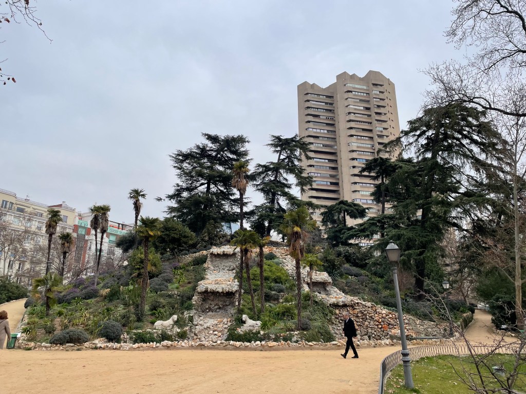 Parque del Oeste is deceptively large and varied. It’s quite long and hilly, clinging to the valley of the Manzanares river on the left bank as the river enters the city centre area. We walk down the valley side and along the park, heading upstream, then cut back up to see the pretty water features that guide a stream down the side of the valley through a series of waterfalls. The sun is shining, and a few people are lazing on the grass, and it feels peaceful and spring-like, even though it’s only mid-February.