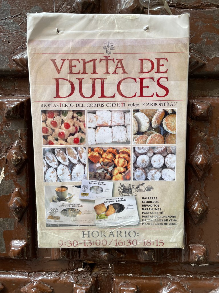 The next stop is the nuns at the Convento de las Carboneras del Corpus Christi, another hidden oddity of the city – although not so much a park, more of a convent. You press the buzzer at a side door to the convent and are allowed in to buy their famous biscuits and cakes. The problem is that they close at 13h and it is now 12:40 – we’d started late and dawdled around the park as we discovered new things and waited around to get pictures of the peacocks with their fancy tails on display, so we are now very likely to miss the nuns.
