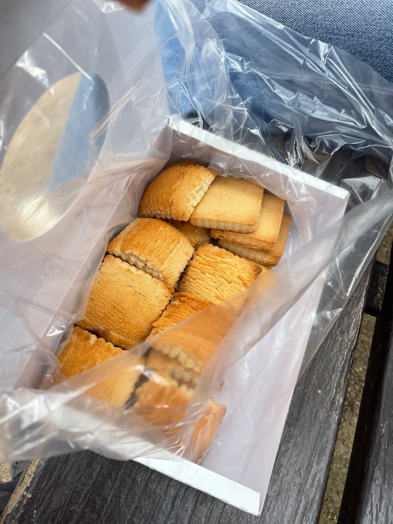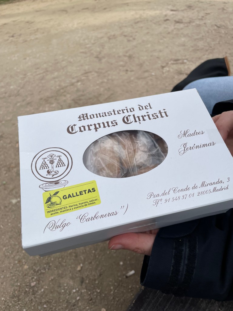 We walk on, into a little courtyard, through another bit of the building, and another courtyard before we get to the tiny room with a lazy-Susan-type-thing where the sales happen. The nuns live behind closed doors, so we don’t see them and they don’t see us, the transactions are made by shouting and putting your money on the thing, and waiting while they spin it around and the packet of biscuits appears.