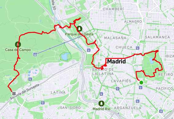 If I want to see the park, I’m going to have sort my foot out, but as we walk past the zoo – peering in to see a lonely wolf howling for attention – my limp is getting worse. We have an exit opportunity at Casa del Campo metro station, just beyond the zoo, and this is tempting, but without the last leg back to the river through the Cuña Verde de Latina and San Isidro parks, it feels incomplete.