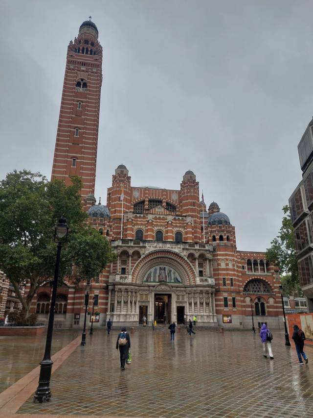 After trying to explain that it wasn’t all hotels in England that don’t make your bed, it’s just the cheap ones (“hotels in England don’t clean the room!”), we got the bus a few stops to avoid the drizzle, getting off outside Westminster Cathedral, the Catholic version of the Abbey just down the road. In contrast to its ancient neighbour, Westminster Cathedral is relatively new (opened in 1903) and is quite different in style being made of cheaper brick in a Roman basilica style rather than the more obvious Gothic style of many of the area’s finer buildings, including the Abbey and Parliament.