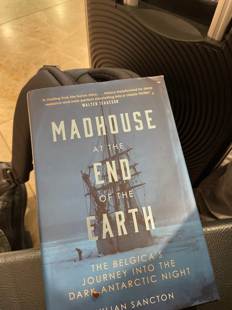 In The Madhouse at the End of the Earth book I am reading, the Belgica is the first first ship to winter in Antarctica below 70º south. They are locked into the ice for months, eventually having to dig their way out to avoid a second winter there, eating raw seal and penguin to avoid scurvy. Their courage is extraordinary, and First Mate Roald Amundsen and ship’s doctor Frederick Cook are particular brave with their adventuring across the ice, climbing icebergs and snow-covered mountains, risking death in crevices and cracks, all in pursuit of exploration … so me not daring to get the bus up to the airport feels a little lame.