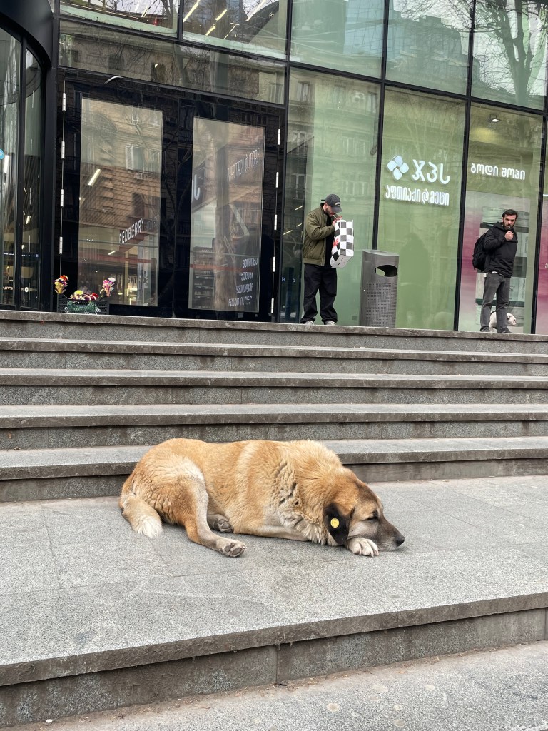 I get to a pedestrian dead end, all ways forward involve death-defying sprints across busy traffic-filled roads, and so I retreat and use a creepy subway tunnel to get back on the other side, away from the river, and walk up to Vakhtang Gorgasali Square. I am surprised to see so many stray dogs wandering listlessly around with their right ears tagged with a yellow label. This tag means they’ve been vaccinated and speyed (or neutered) so – apart from the one who lives beneath my hotel window – they’re docile and friendly.