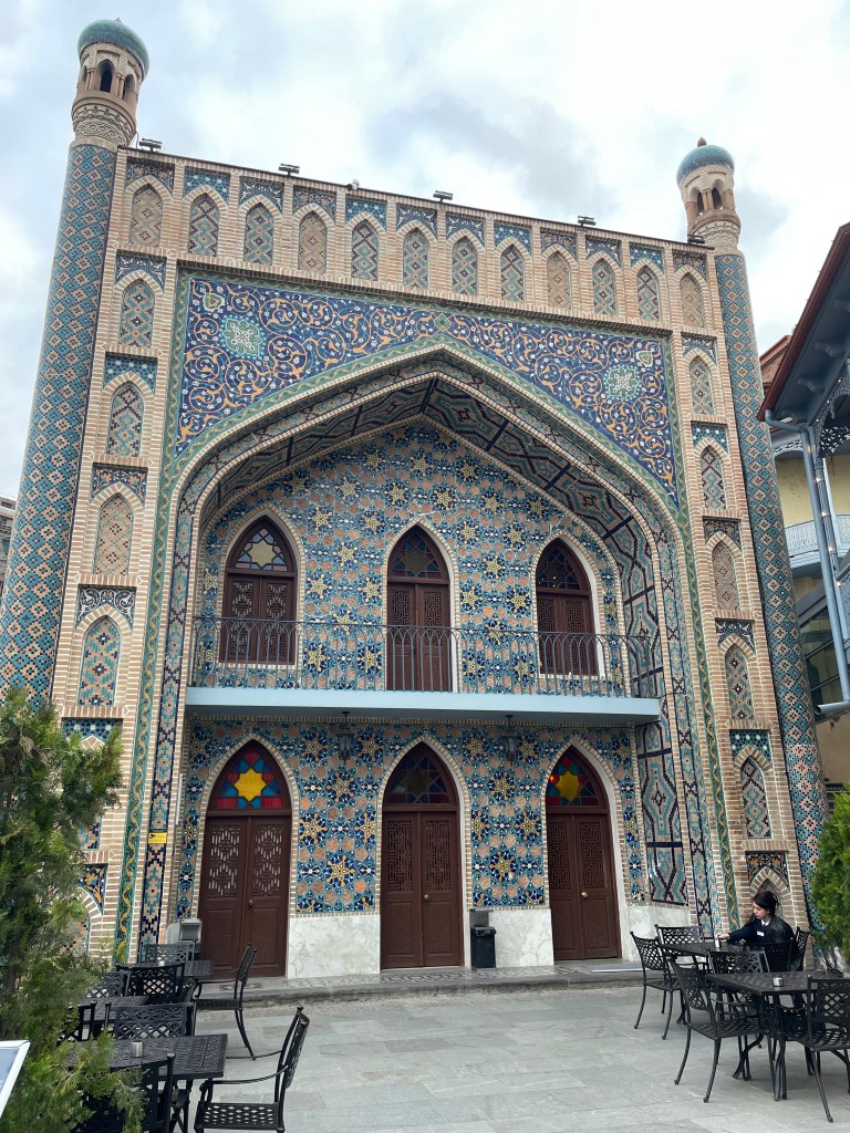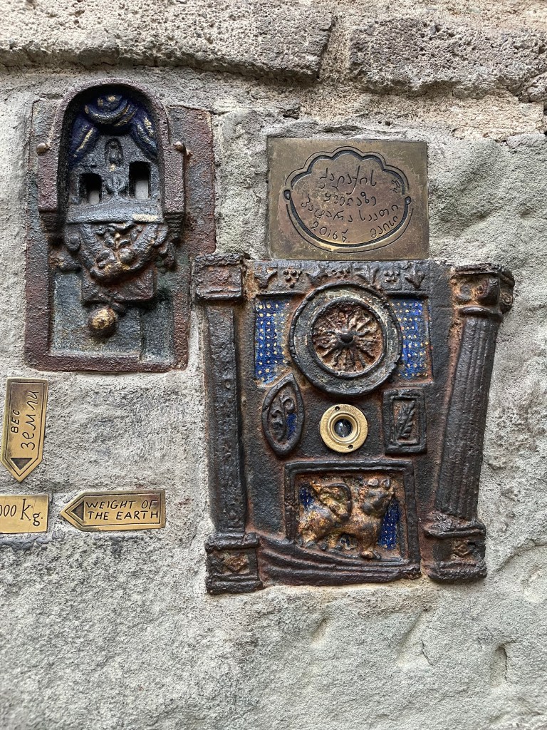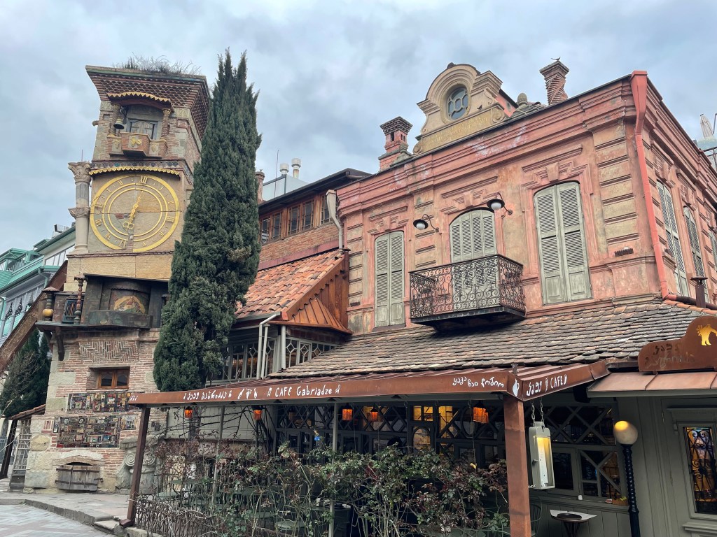 I meet a friend and we walk back via a different route through the old town. She shows me the gorgeously quirky Gabriadze Theatre, a tiny (80 seats) puppet theatre created by writer and performer Rezo Gabriadze. His puppet shows became an institution in Georgia and even toured internationally – and the theatre still performs his shows, although unfortunately there are no tickets left in the few days I’m in town. I linger, admiring the building with it’s crooked clock tower, containing painted doors that open on the hour for an angel to signal the time, and a tiny clock so small I can’t even see it’s a clock.